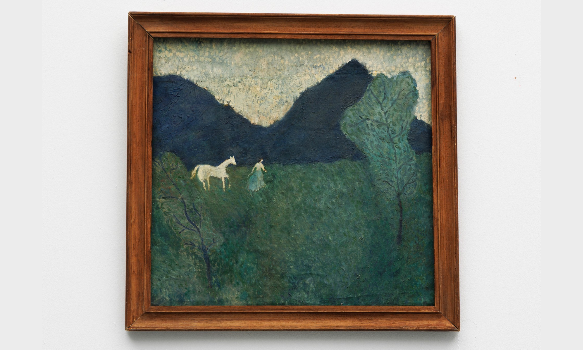 Mia Kokkoni was born in Greece and studied at Glasgow School of Art, where she has continued to live since graduating in 2022. Kokkoni’s paintings connect to a world of storytelling that suggests folk tales and a kind of wistful nostalgia. Painted drily in muted tones, the paintings have an ambiguous quality – they are immediately recognisable and yet also otherworldly. A shuffling cast of characters (solitary women, dancing girls, figures leading horses) simultaneously seem to belong within the paintings and yet question how they got there.