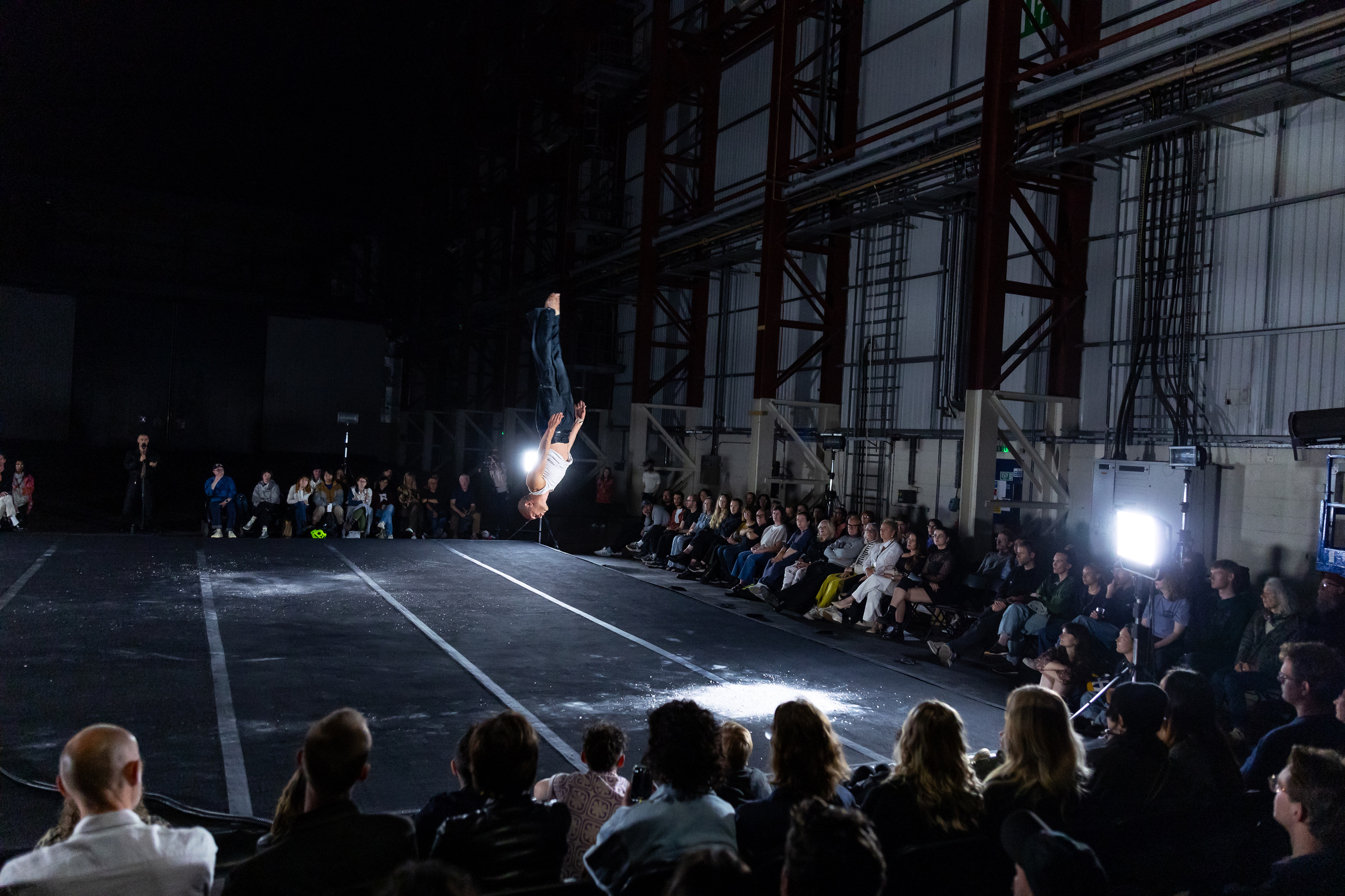Closing out EAF25 was Bornsick, a new performance from London-born queer movement artist Lewis Walker. Co-commissioned with Serpentine, the endurance gymnastics and dance performance sees a body built, piece by piece: a character assembled through learned movements, imposed behaviours, and artificial layers.