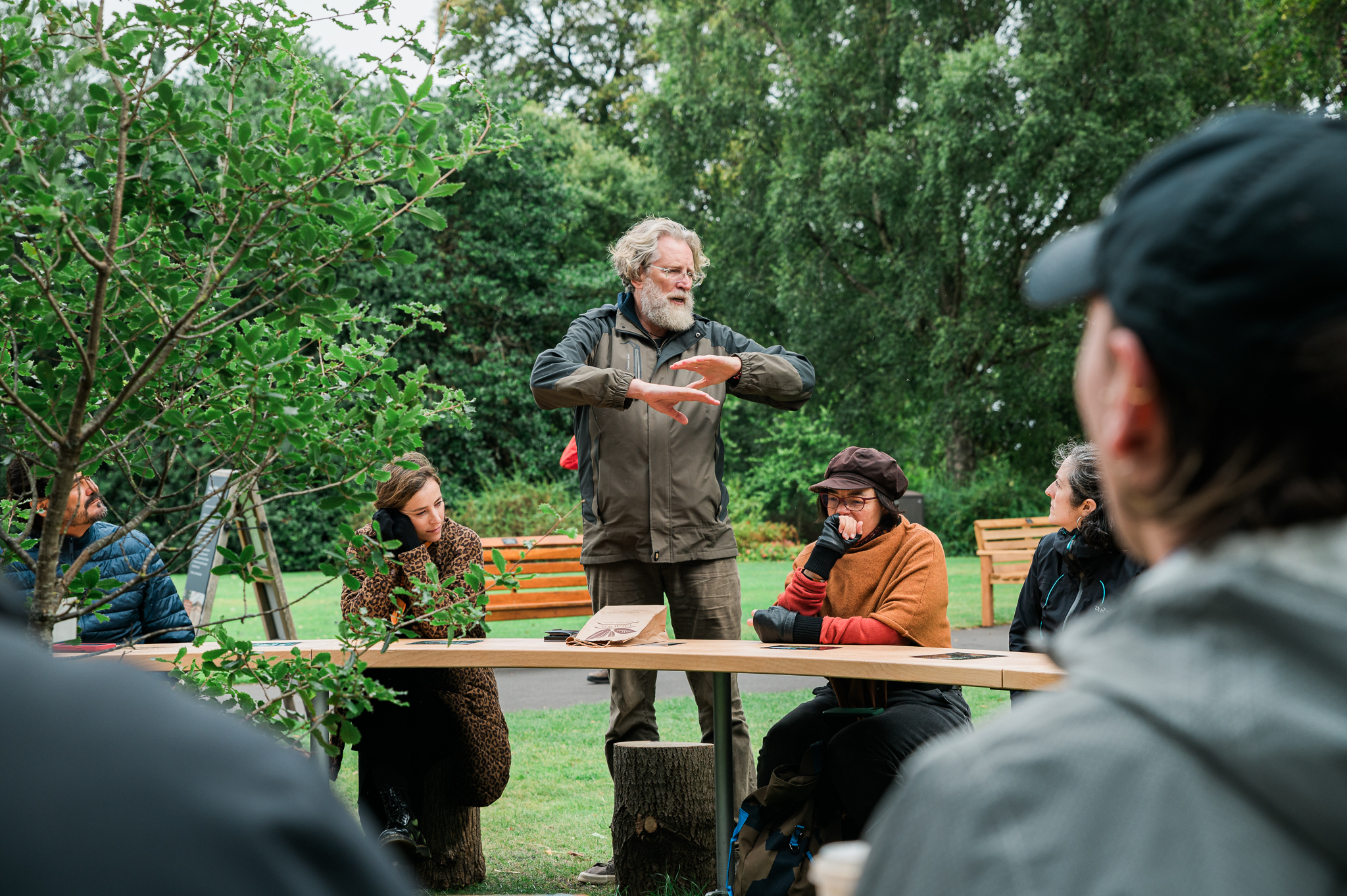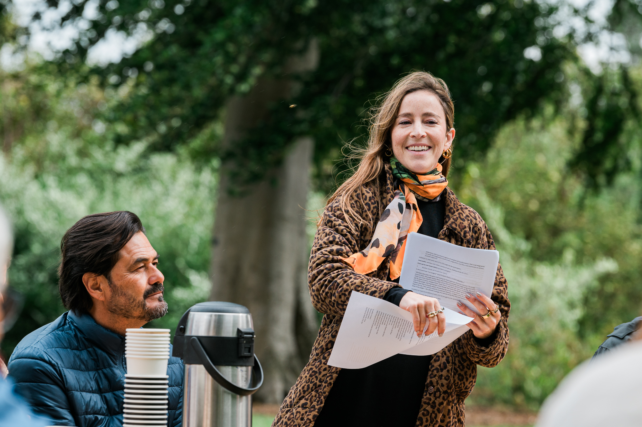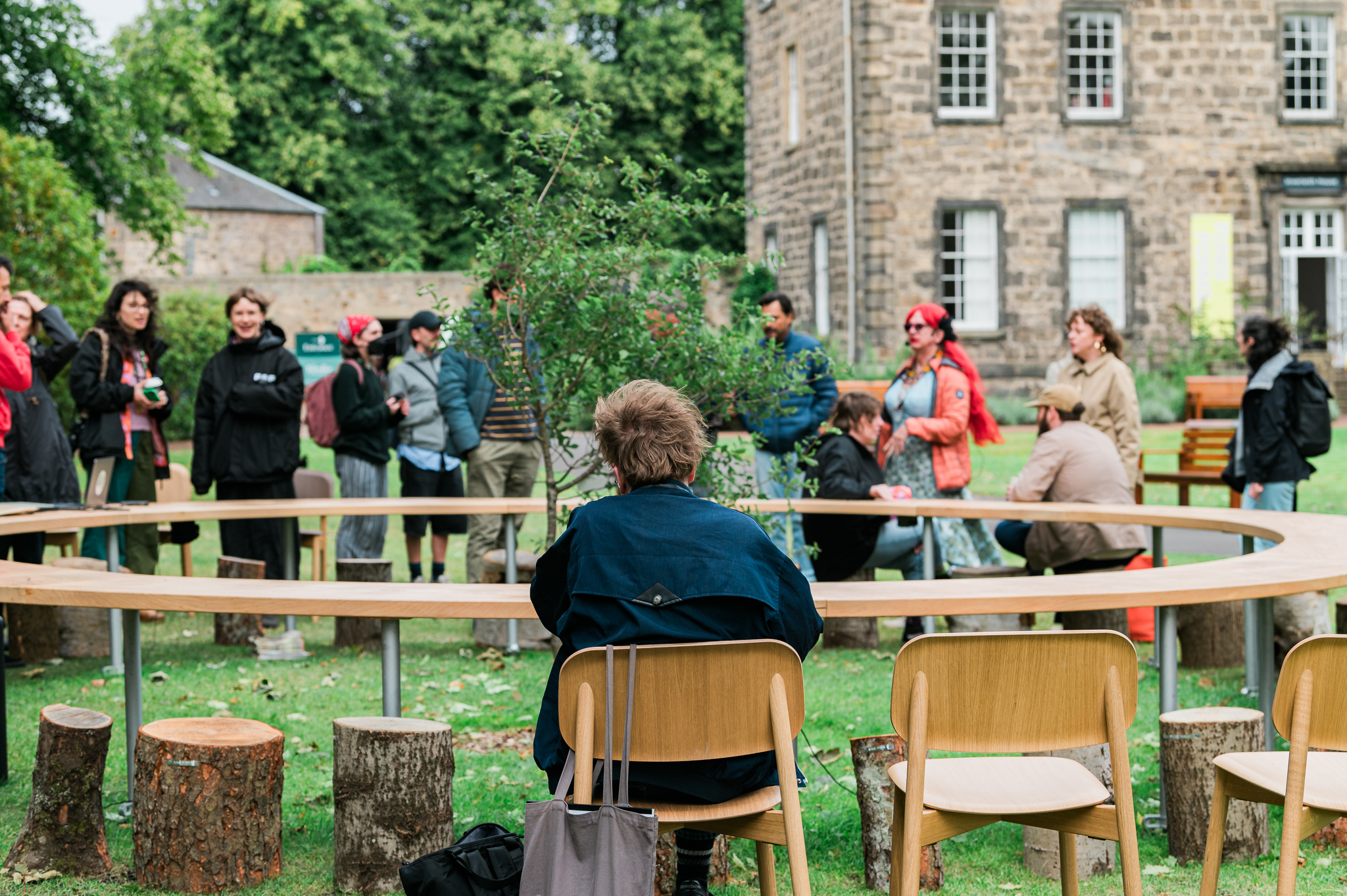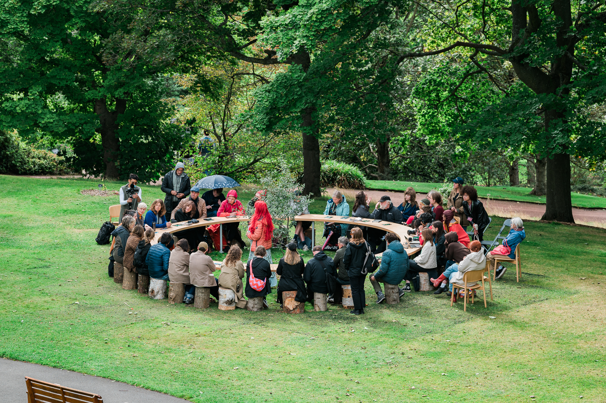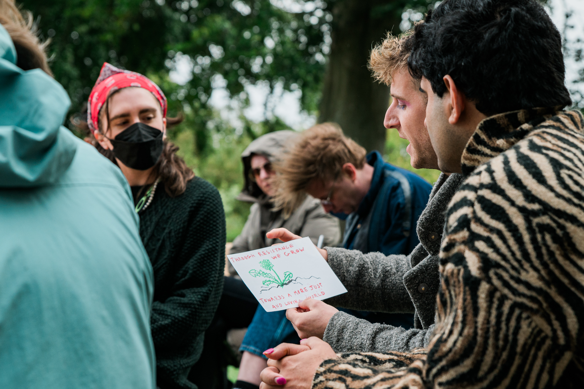 Care considerations: The work spoke openly about the Climate Emergency, and intersecting global crises. The event took place outdoors on a grassy area, with limited stools for seating. This event was BSL interpreted.