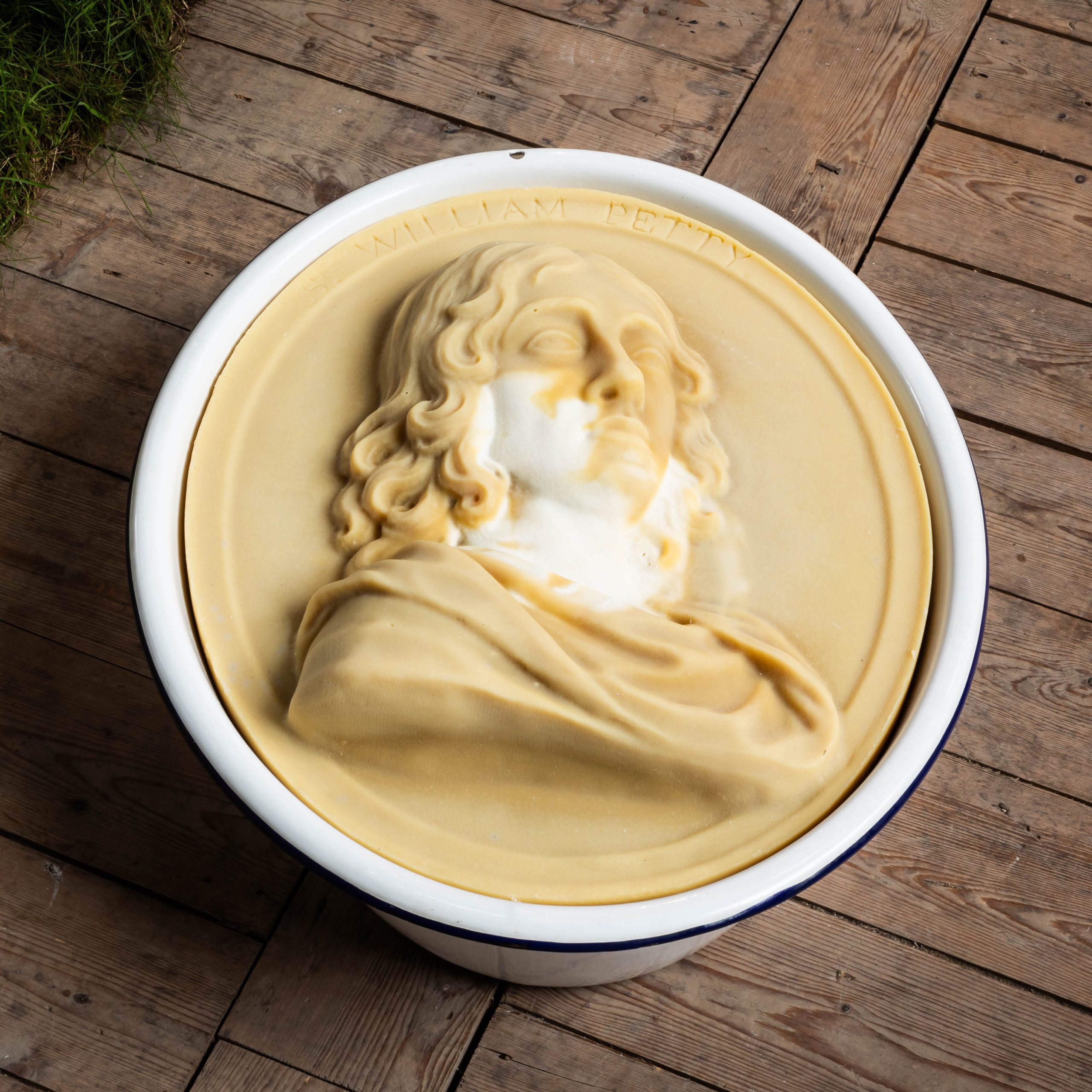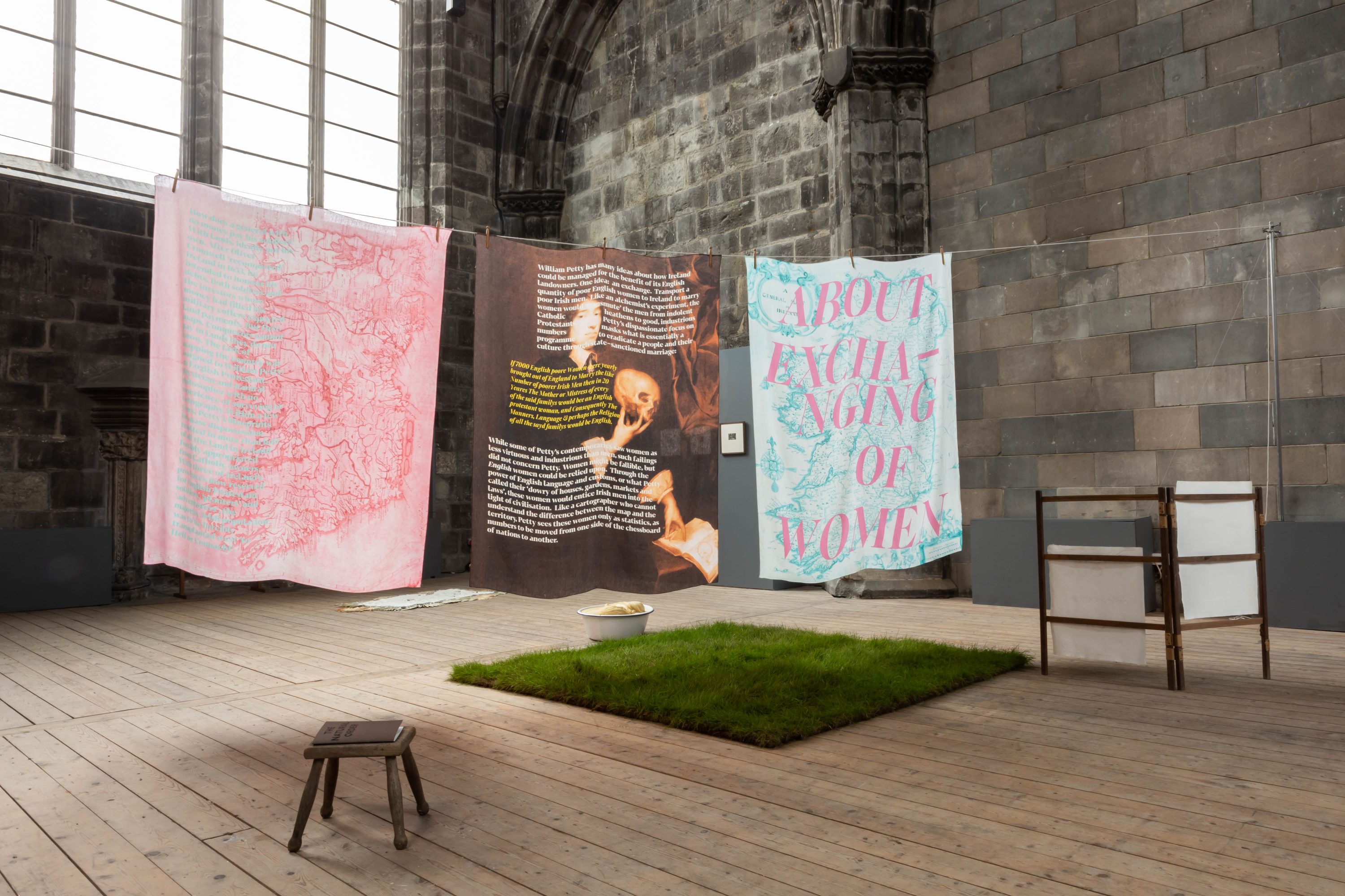 Crystal Bennes presented a collection of works connected to 1670s colonial projects following Oliver Cromwell’s “reconquest” of Ireland. The installation centres on a list of propositions by English colonial administrators to transmute the “uncivilised” Irish into the “cultivated” English: that the Bible should be translated into Irish; that wooden houses be made of stone to create better conditions to make marketable products such as butter, cheese and linen; and that English women brought to marry Irish men should act as agents of colonial transmutation via “their dowry of houses, gardens, markets and laws”.