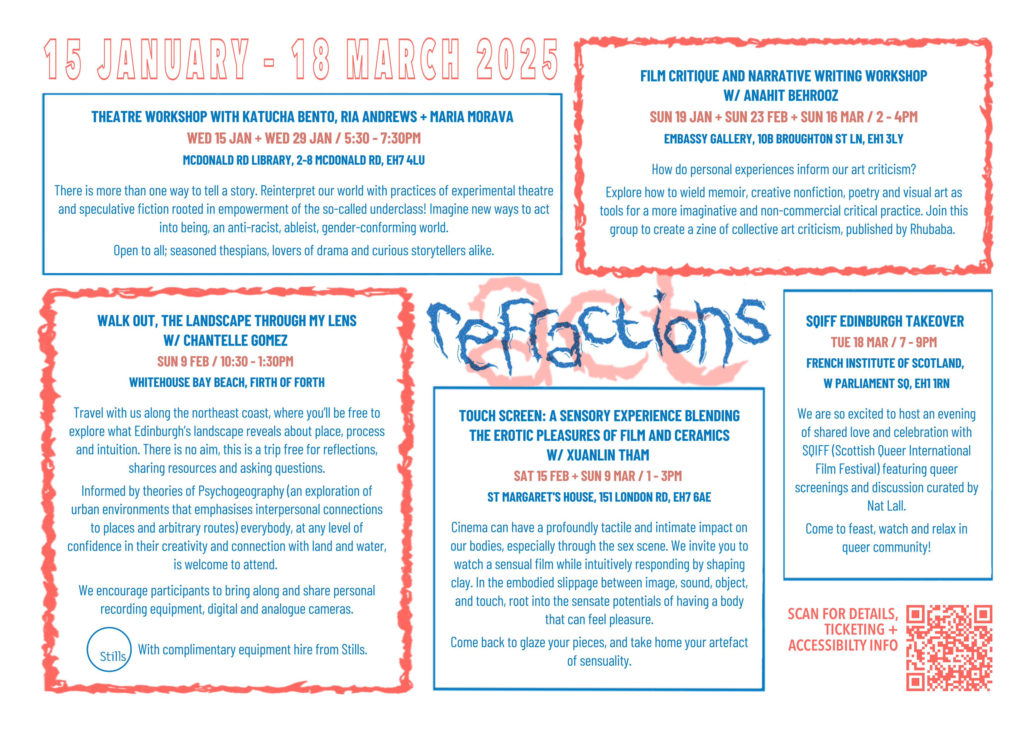 Refractions: New Conceptions of Film + Photography (15 January—18 March) was a free programme of events co-created by Rhubaba and the EAF Civic Programme. The programme aimed to connect marginalised people with creativity through film, theatre, photography, ceramics, writing, and more.