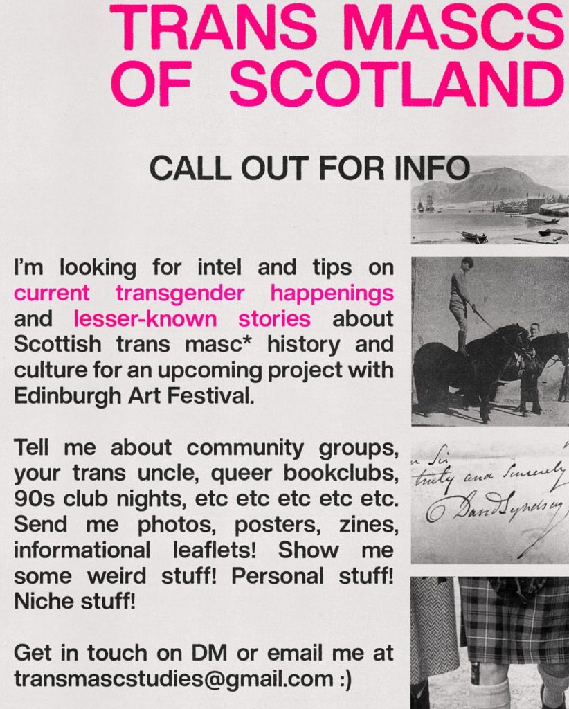 Trans Masc Studies are still looking to connect with masculine-leaning gender diverse people across Scotland from 2025-26, continuing to building a physical record of Scottish trans history and show the full breadth of the culture and the possibilities of trans life.